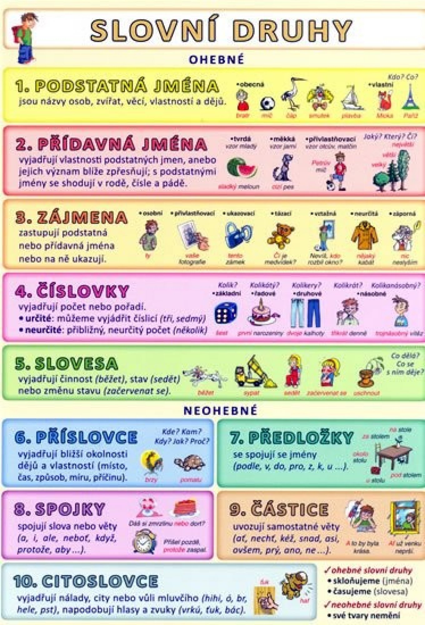 Přehledně zpracované slovní druhy včetně příkladů a názorných ilustrací. Obsahuje mluvnické významy podstatných jmen, vzory, mluvnické významy sloves a příklady na časování sloves. Názorné ilustrace od Petra Kopla.
