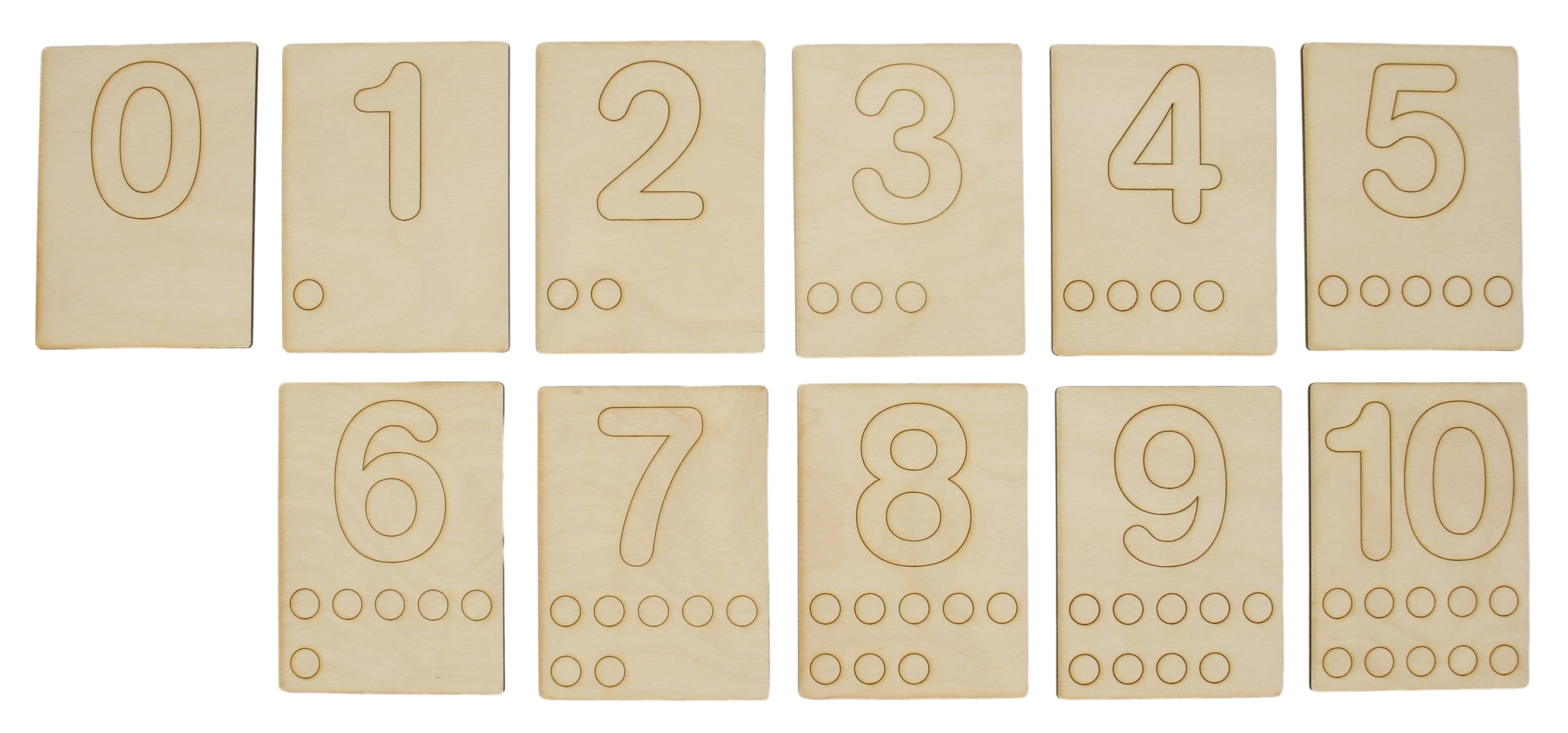 - 2 sady dřevěných destiček - každá sada obsahuje 11 dřevěných destiček s vyglavírovanými čísly (kam se pokládají dřevěná čísla) a kroužky (na pokládání počítacích předmětů).