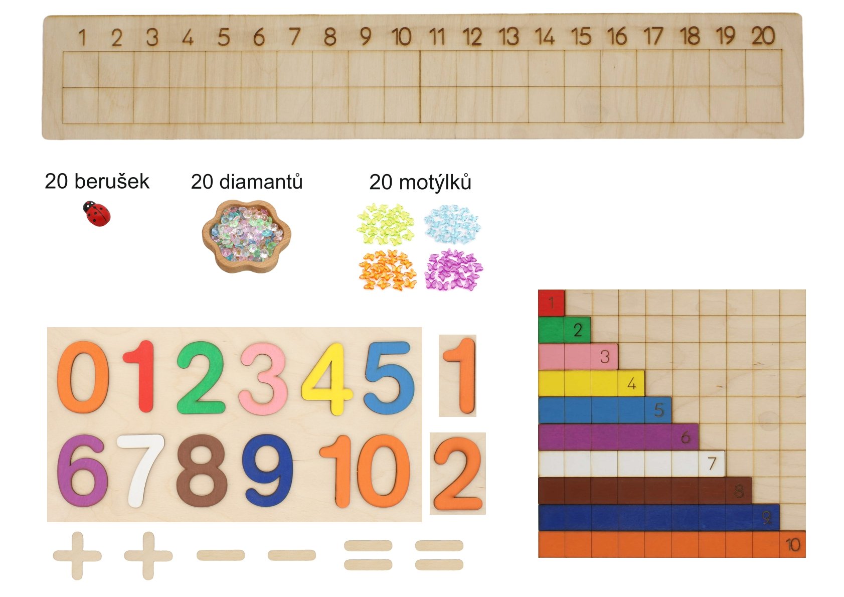 - Počítací předměty: 20 berušek, 20 figurek, 20 diamantů, 20 motýlků.